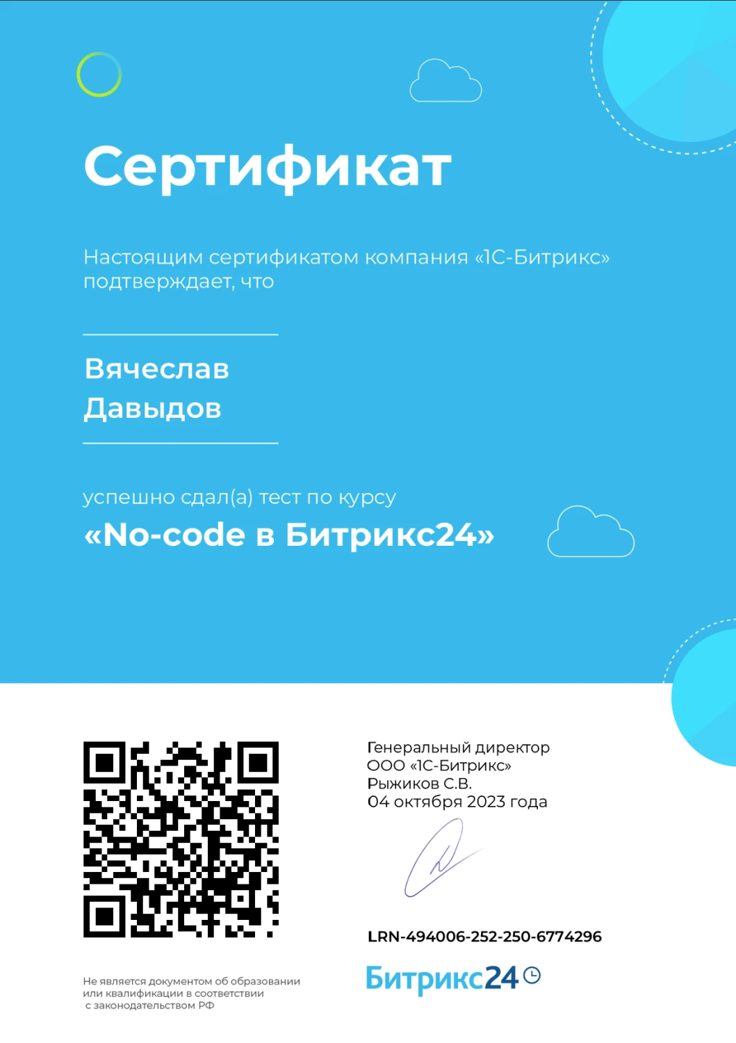 Сертификат по направлению «No-code в Битрикс24»: проектирование смарт-процессов, настройка роботов, форм и воронок без разработки, сокращая сроки внедрения.