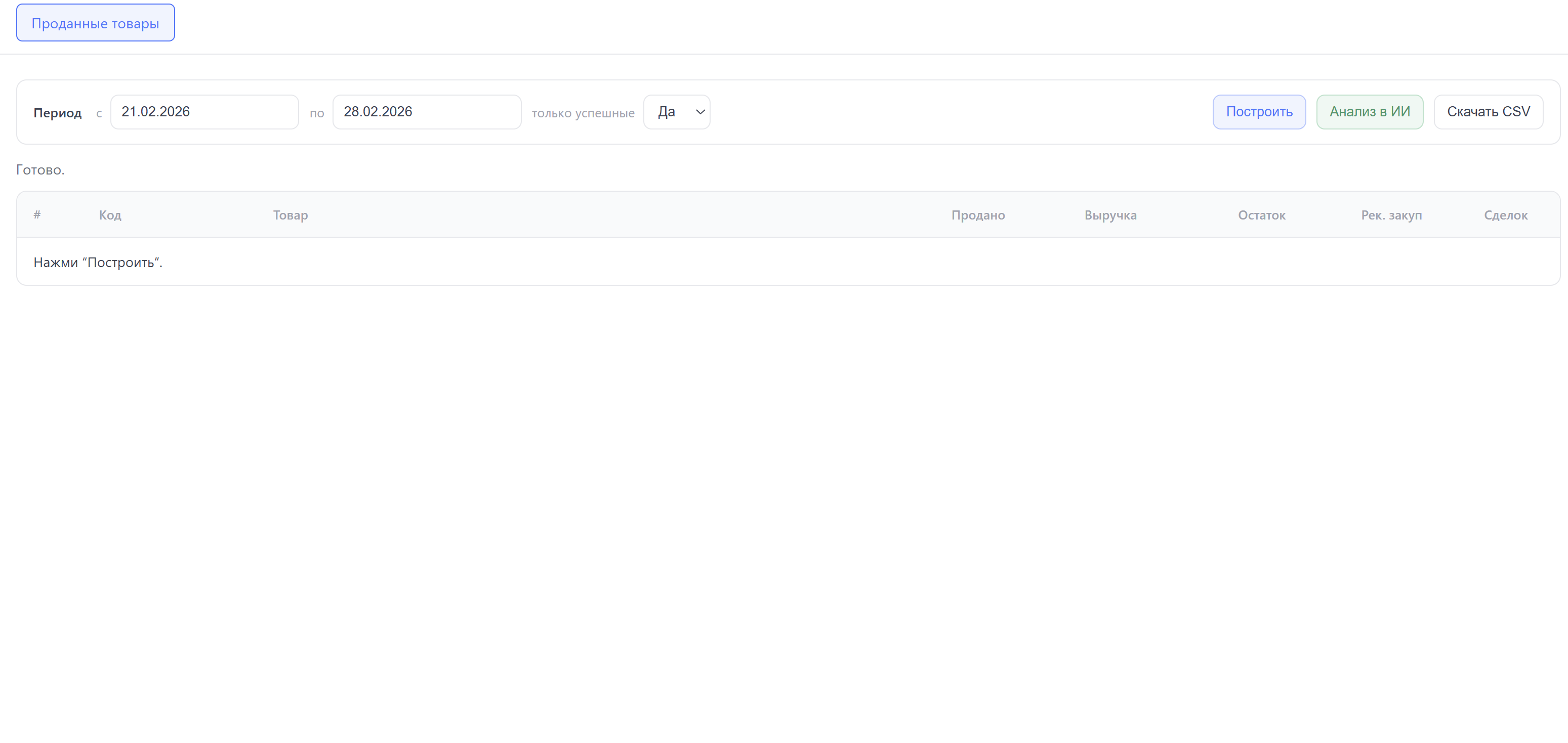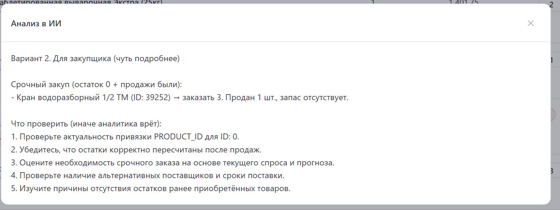 Отчет можно выгрузить в CSV для передачи в бухгалтерию или финансовый отдел. В выгрузке сохраняются все ключевые метрики: ID товара, название, продажи, выручка, остаток, статус, рекомендуемый объем закупки и количество сделок. Система встраивается в управленческий контур компании и работает там, где принимаются решения.