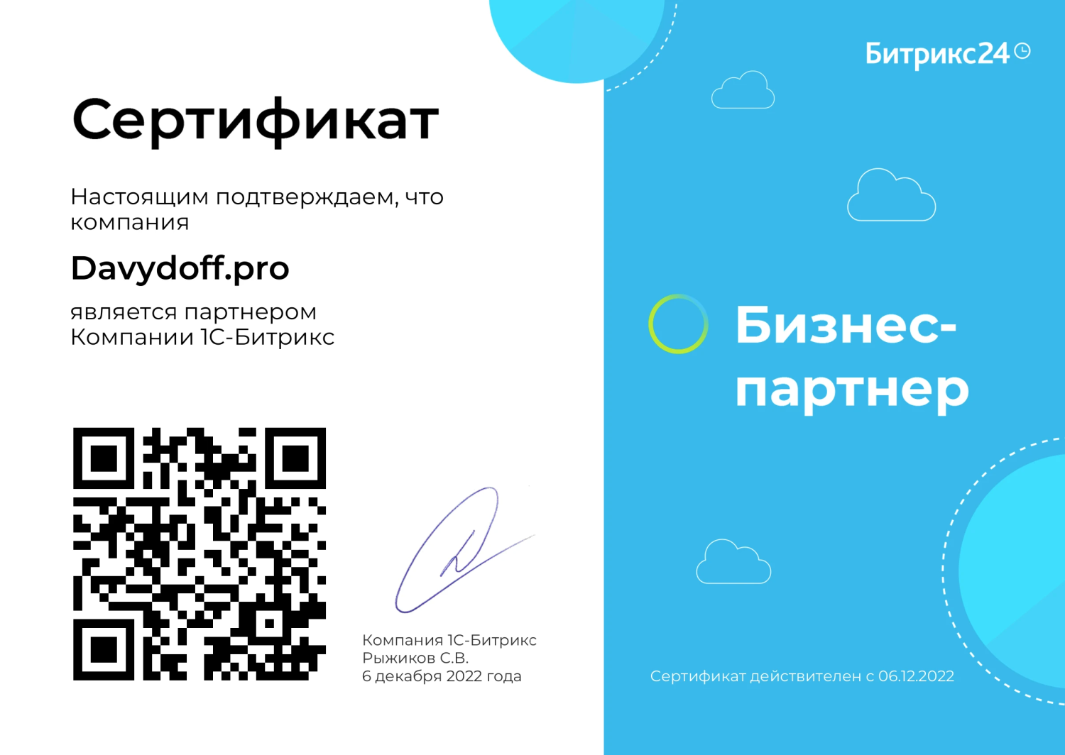 Сертификат подтверждает статус партнёра Битрикс24 и право оказывать услуги по настройке, интеграции и сопровождению платформы.